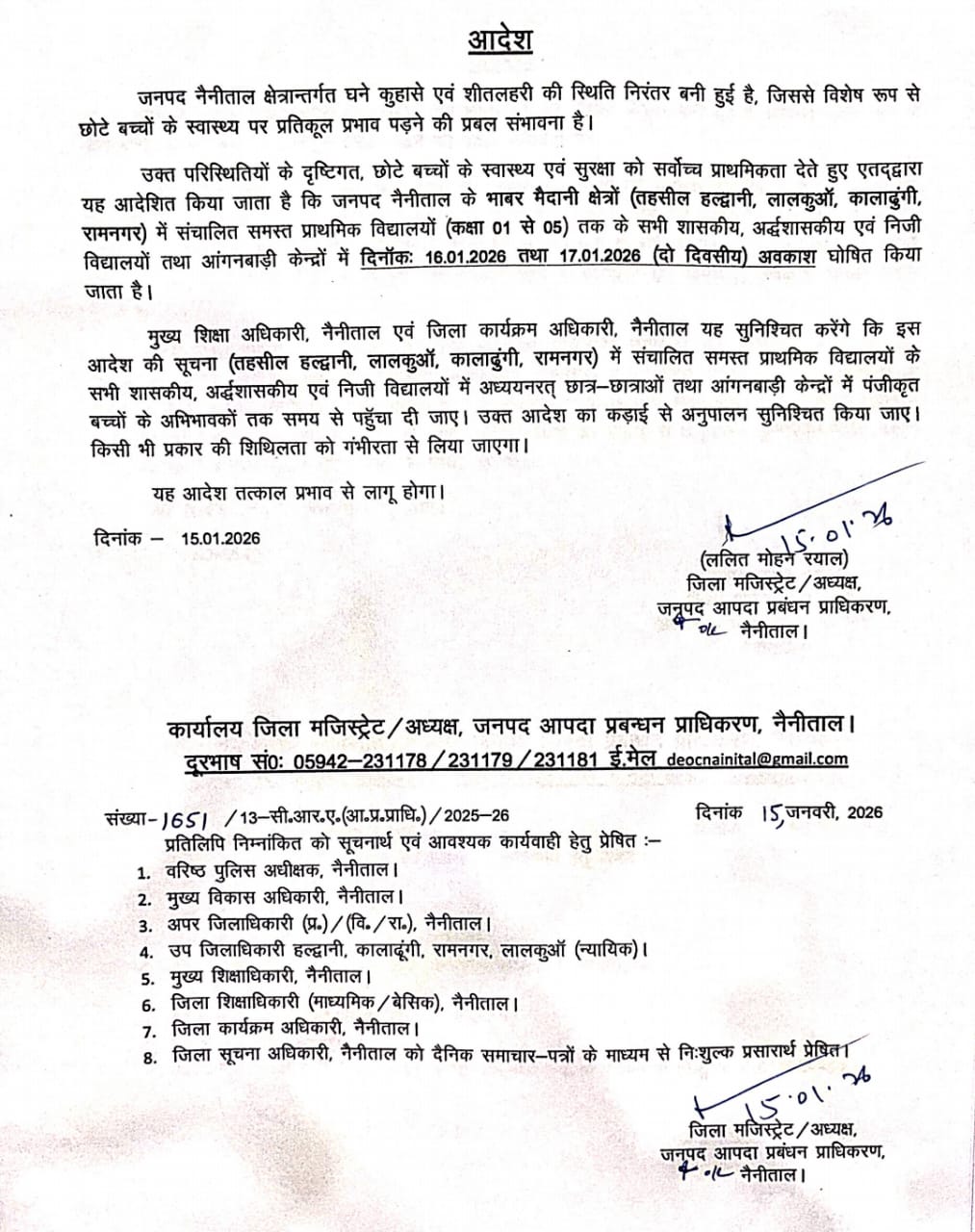 नैनीताल जिले के इन इलाकों में 15 से 17 जनवरी तक बंद रहेंगे स्कूल……..