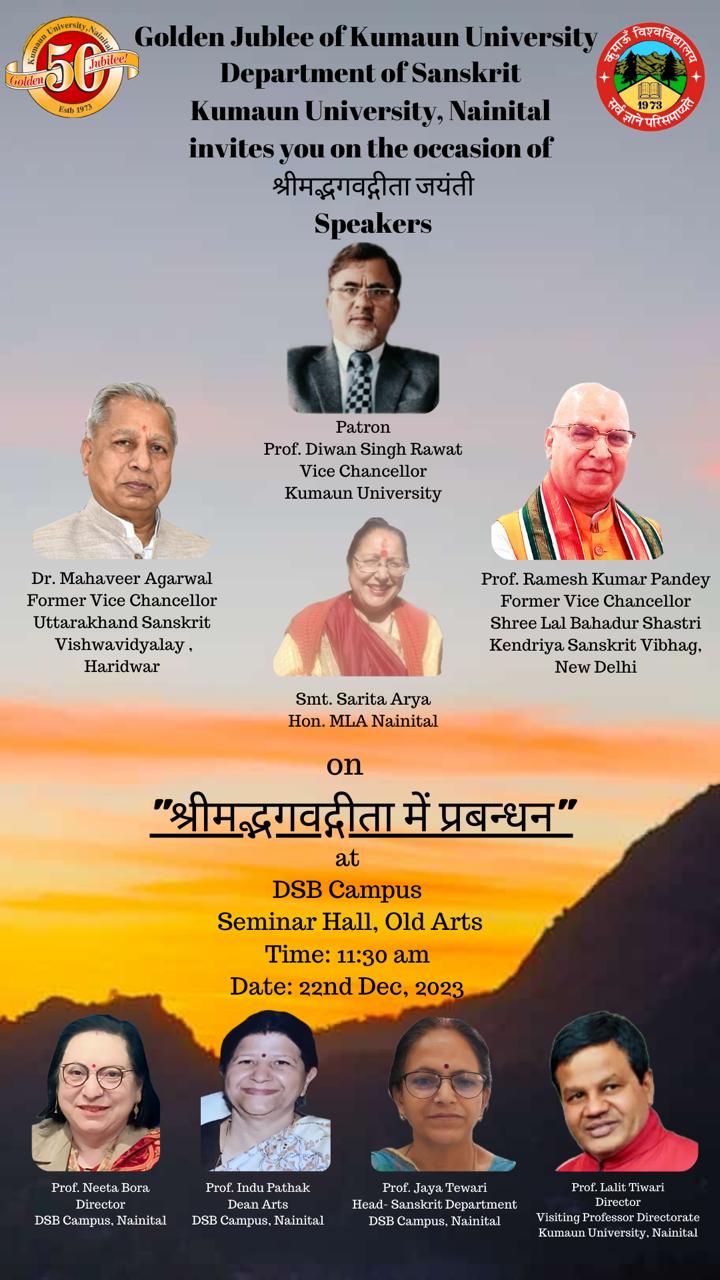कुमाऊं विश्वविद्यालय के संस्कृत विभाग द्वारा 22 दिसंबर को मनाया जायेगा श्रीमद् भगवत गीता महोत्सव….. December 21, 2023
