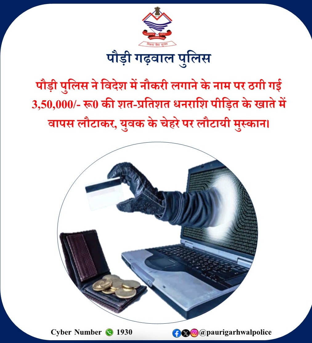 पुलिस ने विदेश में नौकरी लगाने के नाम पर ठगी गई 3,50,000/- रू0 की धनराशि पीड़ित के खाते में वापिस लौटाकर, युवक के चेहरे पर लौटायी मुस्कान…… April 6, 2024