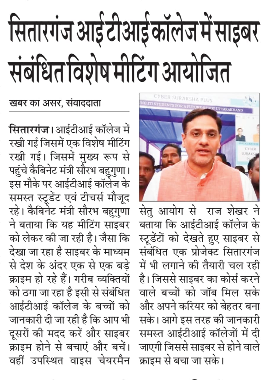 सितारगंज आईटीआई में साइबर जागरूकता कार्यक्रम कैबिनेट मंत्री सौरभ बहुगुणा ने छात्रों को किया संबोधित…. November 18, 2025