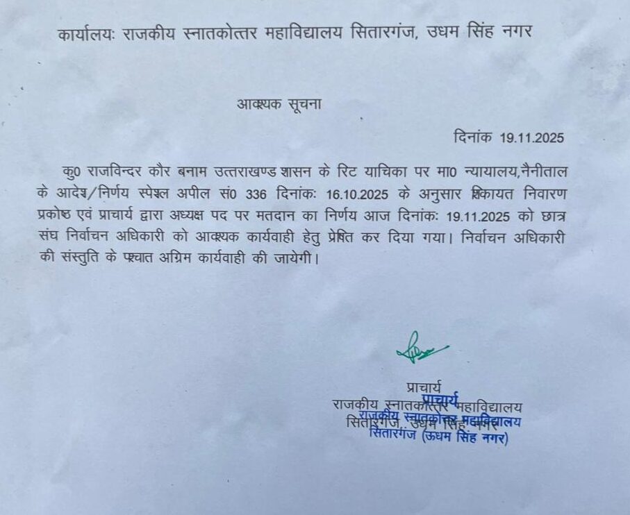 सितारगंज डिग्री कॉलेज में अध्यक्ष पद चुनाव पर विवाद गहराया छात्रों ने चुनाव प्रभारी पर अनदेखी का लगाया आरोप…. November 22, 2025