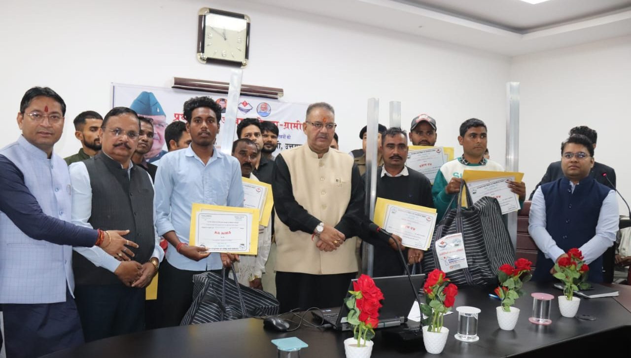 सफल राजमिस्त्रियों को प्रमाण पत्र और टूलकिट उपलब्ध कराया जा रहा है। मंत्री गणेश जोशी ने कहा सर्टिफिकेट उपलब्ध होने के उपरान्त मूल्यॉकन में सफल राजमिस्त्री एक सर्टिफाईड राजमिस्त्री के रूप में राज्य में भविष्य में निर्मित होने वाले प्रधानमंत्री आवासों में कुशल कारीगर के रूप में कार्य कर सकेगें और उनका आजीविका संवर्धन और रोजगार सृजन सुनिश्चित हो सकेगा। इस अवसर पर मंत्री गणेश जोशी ने सभी लाभार्थियों को बधाई और शुभकामनाएं भी दी। इस अवसर अधिशासी निदेशक आर. डी.पालीवाल, सीडीओ विशाल मिश्रा, परियोजना निदेशक हिमांशु जोशी, सहायक निदेशक धीरेंद्र शाह, जिला महामंत्री अमित नारंग सहित कई लोग उपस्थित रहे।