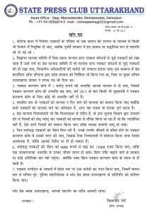 उत्तराखंड स्टे्ट प्रेस क्लब अध्यक्ष विश्वजीत नेगी ने मांग पत्र पढ़ते हुए बताया कि कोरोना काल में दिवंगत पत्रकारों के परिवार के एक सदस्य को उपनल के माध्यम से किसी भी विभाग में नियुक्ति दी जाए, जबकि पूर्ववर्ति सरकार में इस प्रस्ताव पर सद्धांतिक रूप से सहमति भी दी गई थी ,विज्ञापन मान्यता समिति में जिस प्रकार मान्यता प्राप्त पत्रकार संगठनों से जुड़े पत्रकारों को रखा जाता है उसी तर्ज पर प्रेस मान्यता समिति में भी मान्यता प्राप्त पत्रकार संगठनों से जुड़े पत्रकारों को ही रखा जाए, विभागीय अधिकारियों की कमेटी को तत्काल हटाया जाए।