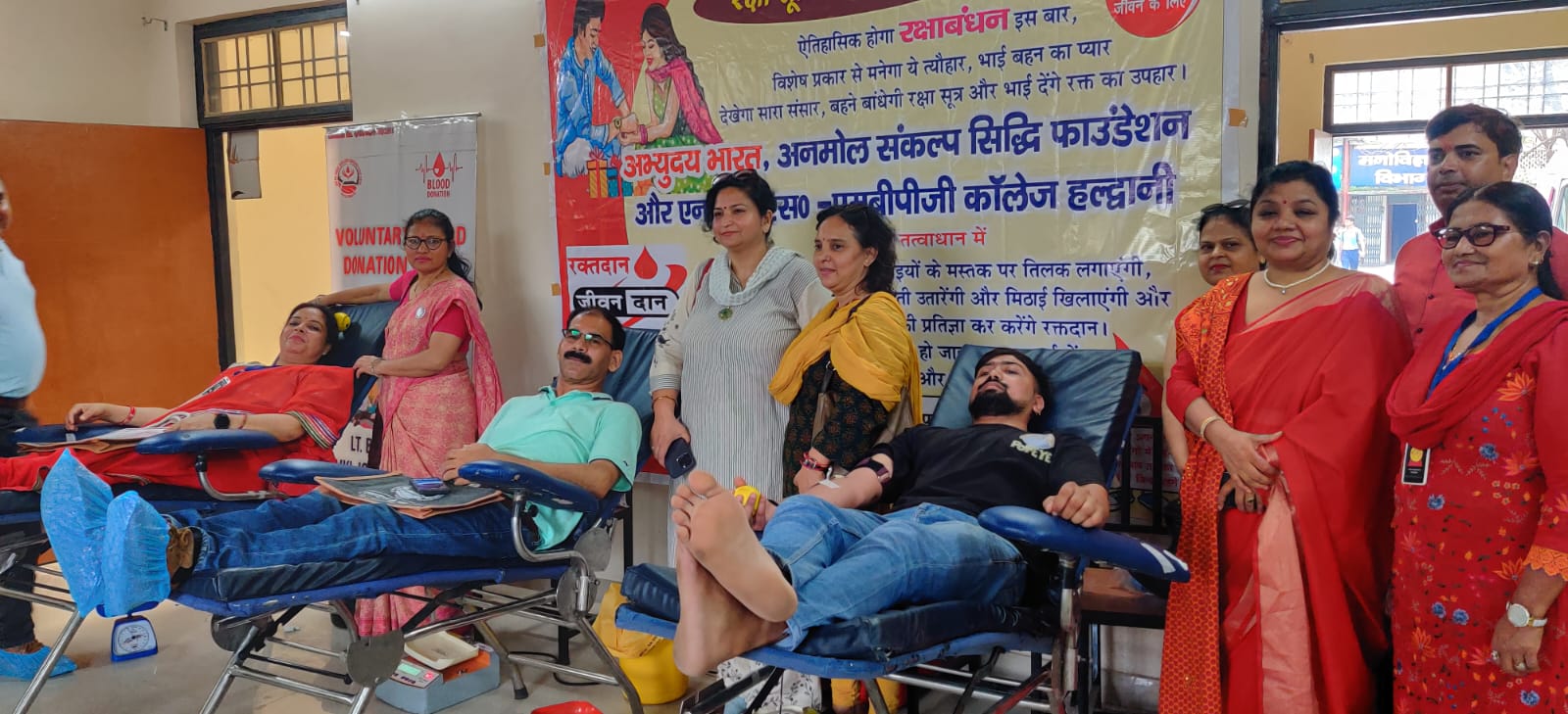 हल्द्वानी-अभ्युदय भारत एवं अनमोल संकल्प सिद्धि हल्द्वानी नस एमबीपीजी कॉलेज हल्द्वानी के संयुक्त तत्वावधान रक्षा बंधन के शुभ अवसर पर रक्षा सूत्र रक्त उपहार में रक्तदान शिविर का आयोजन किया गया। जिसमें करीब 100 यूनिट रक्त का दान किया गया।