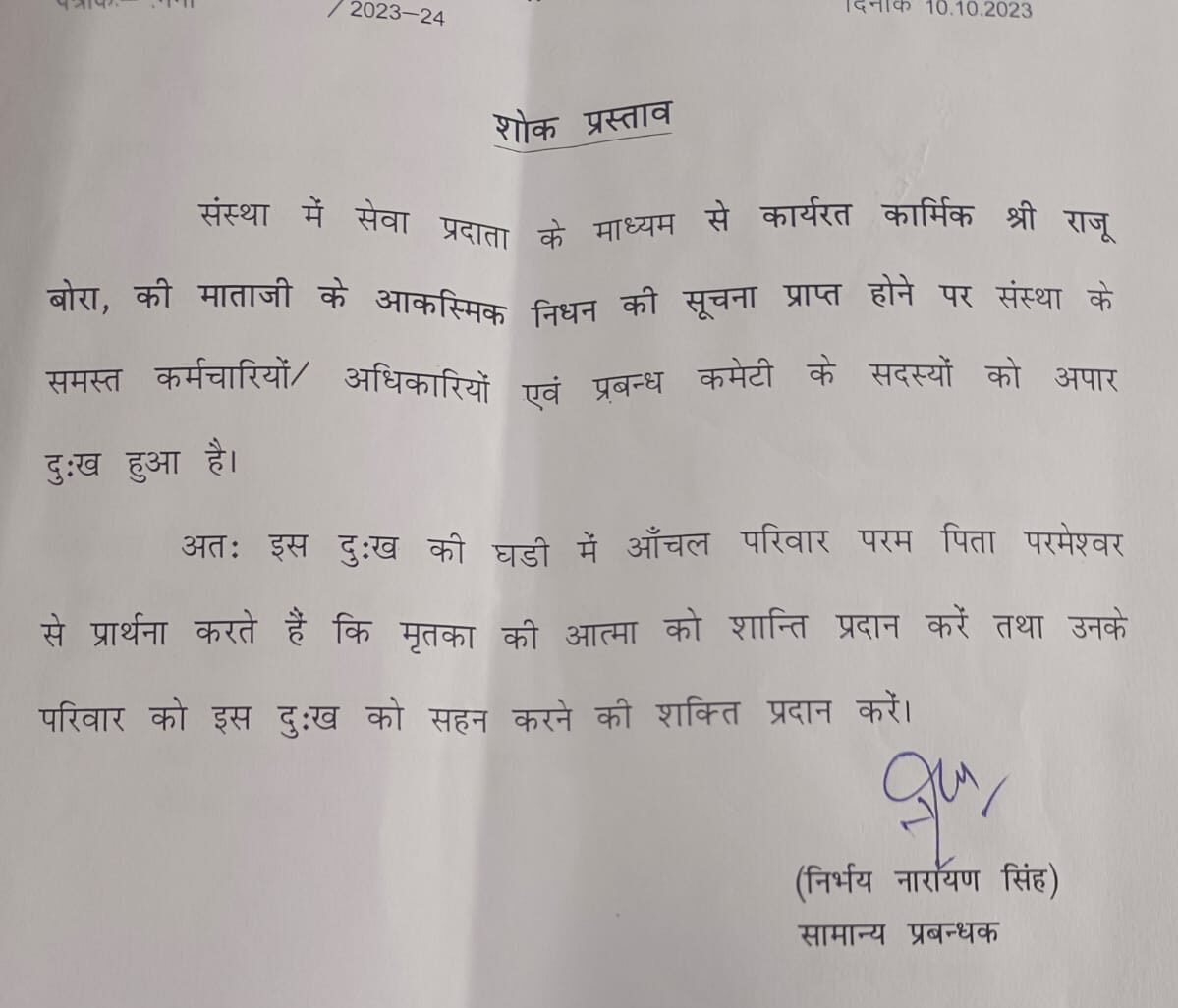 लालकुआं- नैनीताल दुग्ध उत्पादक सहकारी संघ लालकुआं अंतर्गत विपणन अनुभाग में कार्यरत कार्मिक लोकेश शर्मा के पिता जी व लैब में कार्यरत राजू बोरा के माताजी के आक्समिक निधन पर समस्त आंचल परिवार द्वारा गहरा दुखः व्यक्त कर उनकी आत्मा की शान्ति हेतु मौन रखकर शोक संवेदना व्यक्त की गई ।
