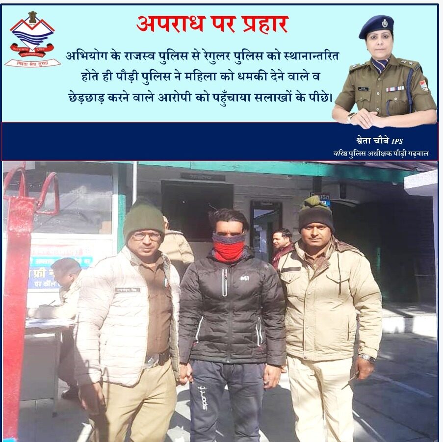 पौड़ी- वादिनी स्थानीय निवासी द्वारीखाल द्वारा राजस्व पुलिस चौकी मल्ला ढांगू-02 में शिकायती प्रार्थना पत्र दिया कि वादिनी के साथ अकबर निवासी नगीना उ0प्र0 ने छेड़खानी कर धमकी दी है। शिकायती प्रार्थना पत्र के आधार पर राजस्व पुलिस चौकी मल्ला ढांगू-02 में मु0अ0सं0-03/23, धारा- 354, 384, 504, 506 भादवि बनाम अकबर पंजीकृत किया गया। अभियोग गम्भीर प्रवृति का होने के कारण राजस्व पुलिस से रेगुलर पुलिस को स्थानान्तरित हुआ।