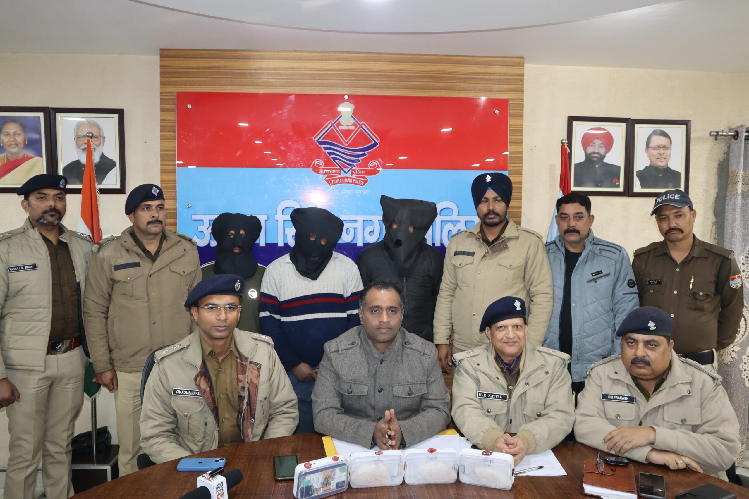 रुद्रपुर- ऊधमसिंहनगर की पुलभट्टा पुलिस को बड़ी सफलता, पुलिस ने चैकिंग के दौरान 365 ग्राम ड्रग्स क्रिस्टल मेथ के साथ तीन बड़े तस्करों को गिरफ्तार किया है। बरामद ड्रग्स की कीमत 1.82 करोड़ रुपए बताई जा रही है। उधमसिंह नगर एसएसपी मंजूनाथ टीसी ने पुलिस टीम को 2500 रुपए का ईनाम देने की घोषणा की है। एसएसपी मंजूनाथ टीसी ने खुलासा करते हुए बताया कि देर-रात पुलभट्टा थानाध्यक्ष कमलेश भट्ट टीम के साथ चैकिंग कर रहे थे,