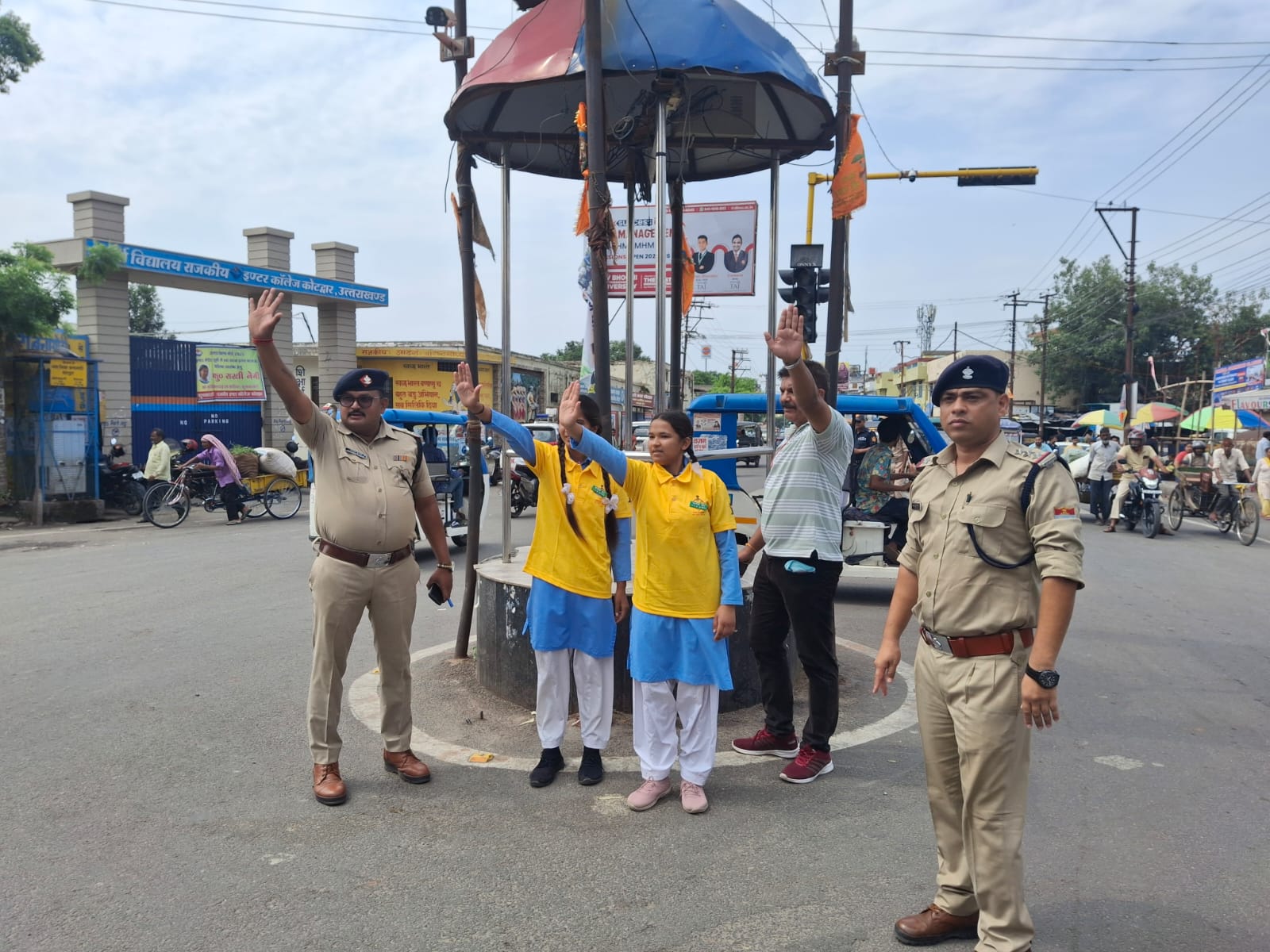 स्कूली बच्चों द्वारा यातायात संचालन के दौरान यातायात नियमों का पालन करने हेतु लोगों को किया प्रेरित