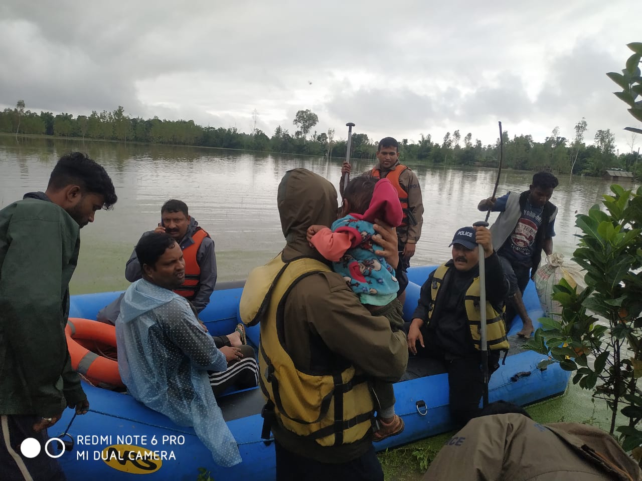 रुद्रपुर– (एम सलीम खान) सितारगंज के शक्ति फार्म क्षेत्र में मंगलवार की सुबह सूखी नदी/ वैगुल नदी का जलस्तर बढ जाने के कारण उसके अंतर्गत आने वाले ग्राम अरविन्दनगर न0 7,8,9 और ग्राम राजनगर में बाढ़ आ गयी । बाढ़ के आने से 95 परिवार के लोग पानी की चपेट में आ गये | जिसके बाद कुमाऊं परिक्षेत्र के पुलिस उपमहानिरीक्षक और जनपद उधम सिंह नगर के वरिष्ठ पुलिस अधीक्षक ने आपदा राहत संबंधी निर्देशानुसार राहत-बचाव का कार्य शुरू कर बाढ में फंसे बुजुर्ग, महिलाओं और बच्चो को रेस्कयू किया | सूचना प्राप्त होने पर तत्काल प्रभारी निरीक्षक प्रकाश सिंह दानूमय ने पुलिस फोर्स के साथ राहत और बचाव कार्य शुरू कर दिया था । जिसके बाद रेस्कयू में लगभग सभी परिवारों के 300 लोगों को सुरक्षित स्थानो पर पहुंचाया गया। बाढ़ से प्रभावित लोगों को ग्राम पंचायत, अरविन्दनगर की प्राथमिक पाठशाला, बरूवाबाग झाडी प्राथमिक स्कूल और राहत शिविरों में ड्यूटीरत आईआरबी पुलिस और पुलिस के वाहनों से सकुशल पहुंचाया गया ।