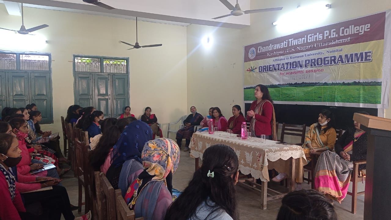 काशीपुर ( सुनील शर्मा )बीते रोज को बी कॉम प्रथम वर्ष की छात्राओं का अभिविन्यास कार्यक्रम रखा गया जिसमें कार्यक्रम संचालक डॉ शोभित त्रिपाठी ने छात्राओं को पावर पॉइंट के माध्यम से बीकॉम विभाग की विस्तृत जानकारी दी। दिनांक 30 11:00 2021 को बी ए प्रथम वर्ष की छात्राओं हेतु अभिविन्यास कार्यक्रम आयोजित किया गया जिसमें कार्यक्रम संचालिका डॉ वंदना सिंह ने नव प्रवेशित छात्राओं का स्वागत करते हुए महाविद्यालय की स्थापना एवं संस्थापक श्रद्धदेय स्वर्गीय सत्येंद्र चंद्र गुड़िया ने बालिका शिक्षा के लिए उनके दिए गए योगदान से अवगत कराया तत्पश्चात महाविद्यालय में संचालित विभिन्न विषयों की प्राध्यापिकाओ ने अपना-अपना परिचय देते हुए अपने विषय की विस्तृत जानकारी दी महाविद्यालय के प्रभारी प्राचार्य डॉक्टर दीपिका गुड़िया आत्रेय ने छात्राओं का स्वागत करते हुए महाविद्यालय के नियमों संचालित गतिविधियों एनएसएस कृष्णा सांस्कृतिक कार्यक्रम छात्रसंघ महाविद्यालय के नियमों संचालित गतिविधियों एन.एस. एस. कृरणा सांस्कृतिक कार्यक्रम छात्रसंघ चुनाव की जानकारी देते हुए छात्राओं को नियमित रूप से महाविद्यालय आने के लिए प्रेरित किया एवं उनके भविष्य उज्जवल भविष्य की कामना की। कार्यक्रम में महाविद्यालय की डॉ. मंजू सिंह, डॉ रमा अरोरा, डॉ.अंजली गोस्वामी, डॉ. रंजना ,डॉ ज्योति गोयल ,डॉ पुष्पा धामा, शीतल अरोरा, मीनाक्षी पंत, दीक्षा मेहरा,डॉ शोभित त्रिपाठी, कुमारी श्रद्धा शर्मा, कृति टंडन आदि स्टाफ उपस्थित था